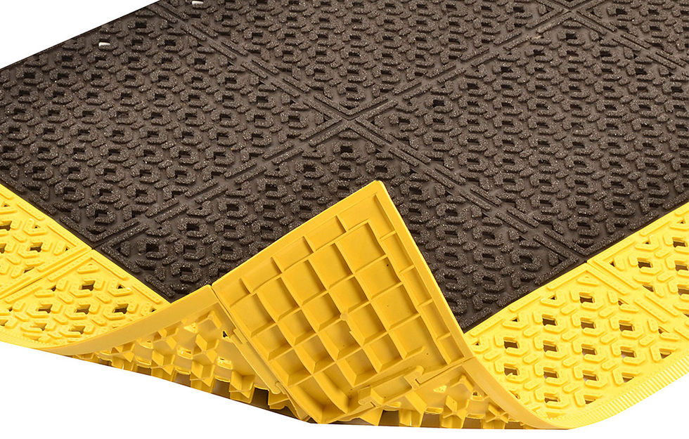 Cushion-Lok™w / Grip-Step®is a heavy-duty vinyl-based work mat, with a coarse-grain top surface, designed for slippery wet environments, where resistance to industrial chemicals is necessary. Cushion-Lok™ with Grip-Step®has hundreds of gaps to facilitate drainage while the worker is elevated on a series of blades to increase traction and keep the worker out of the spill. It also comes in an HD (Heavy-Duty) version with a reinforced bottom design to withstand extreme weight shredding.